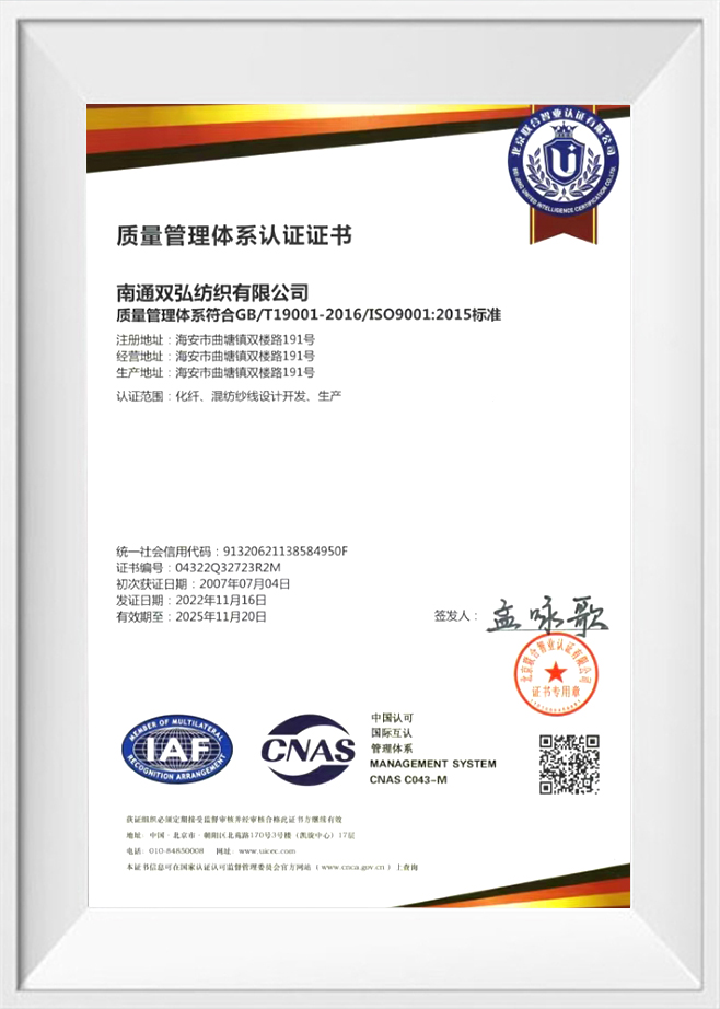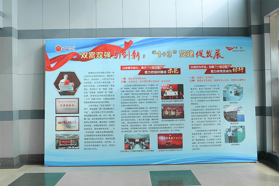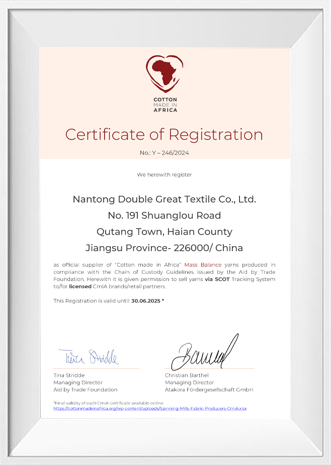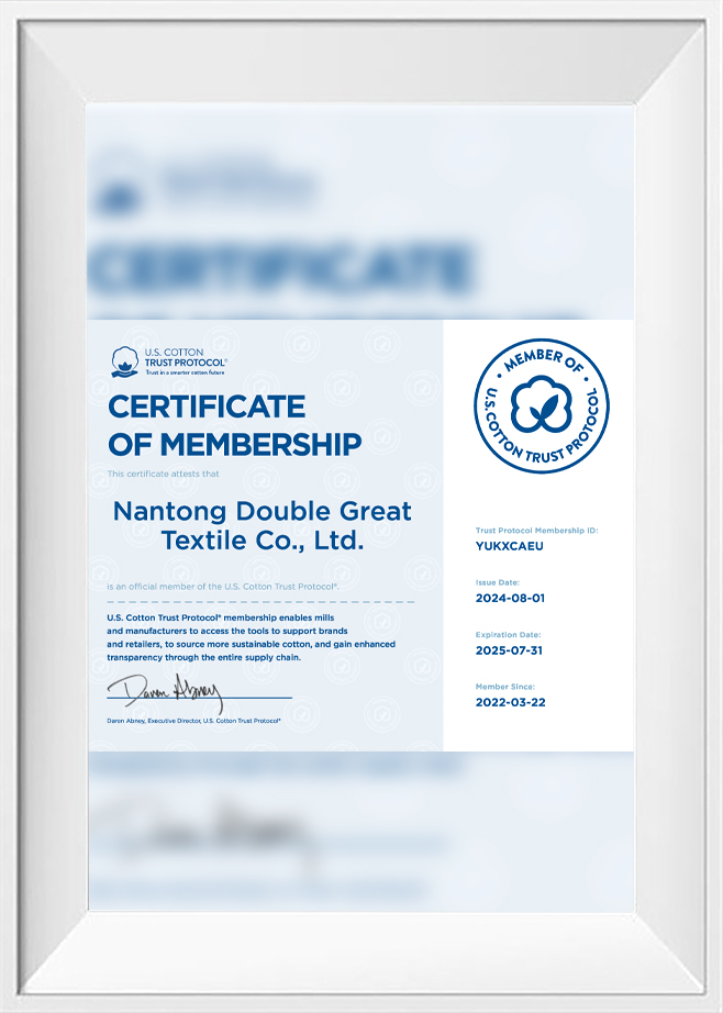 Nantong Double Great Textile Co.,Ltd. là một doanh nghiệp quay bông chuyên sản xuất các sợi chất lượng cao. Đây là cơ sở quốc gia để sản xuất sợi pha hóa hóa chất chất lượng cao, cơ sở quốc gia cho nghiên cứu và sợi đan, cơ sở quốc gia để phát triển các sợi xanh khác biệt, một trong 20 nhà sản xuất sợi sợi ngắn polyester hàng đầu, và là đơn vị phó chủ tịch của Hiệp hội ngành công nghiệp dệt bông Trung Quốc. Trong bốn mươi năm qua, công ty đã tập trung vào việc sản xuất các sợi chất lượng cao, tuân thủ nguyên tắc chất lượng và sự xuất sắc.