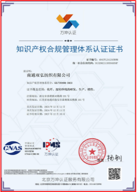 Chứng nhận hệ thống quản lý tuân thủ sở hữu trí tuệ là một hoạt động đánh giá phù hợp trong đó cơ quan chứng nhận của bên thứ ba đánh giá hệ thống quản lý sở hữu trí tuệ nội bộ của một doanh nghiệp để xác nhận rằng nó tuân thủ các yêu cầu của các tiêu chuẩn quốc gia hoặc thông số kỹ thuật liên quan. Hiện tại, Double Great Company có 5 nhãn hiệu đã đăng ký trong nước và 2 nhãn hiệu đăng ký quốc tế Madrid. Thương hiệu gấp đôi là một nhãn hiệu nổi tiếng ở Trung Quốc; Nó có hơn 50 bằng sáng chế phát minh quốc gia và bằng sáng chế mô hình tiện ích, và đã giành được Giải thưởng Vàng bằng sáng chế của ngành Dệt may Trung Quốc; Nó đã thực hiện 4 dự án Torch quốc gia và 5 Spark Plan; Nó đã xây dựng 3 tiêu chuẩn quốc gia, 11 tiêu chuẩn công nghiệp, 4 tiêu chuẩn nhóm và 3 tiêu chuẩn tiêu thụ đơn vị thương mại chế biến hải quan; Nó đã thực hiện nghiên cứu đại học trong ngành, và 5 dự án thành tích khoa học và công nghệ và công nghệ chính đã giành giải thưởng thứ hai của tiến bộ khoa học và công nghiệp ngành công nghiệp dệt may Trung Quốc.